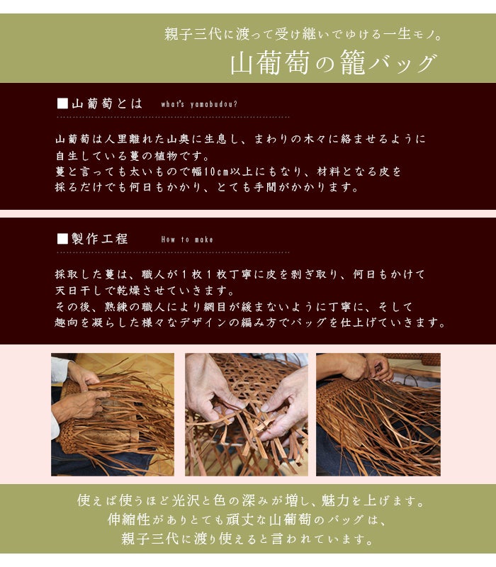 古来より愛されてきた山葡萄の蔓で加工されたアイテムは、使えば使うほどに色味も深く、ツヤが増し、その時その時で変化を楽しめるのも魅力の1つです。