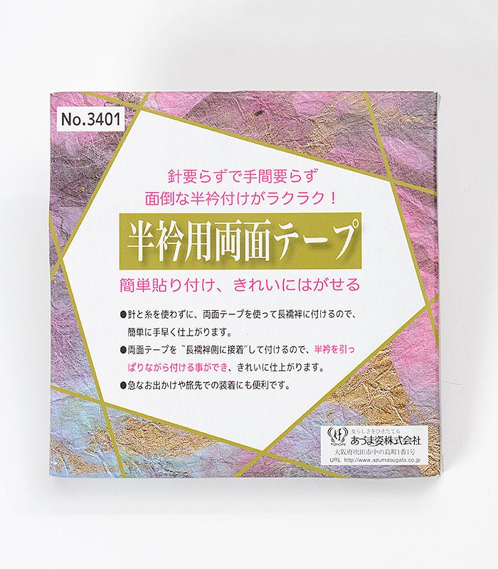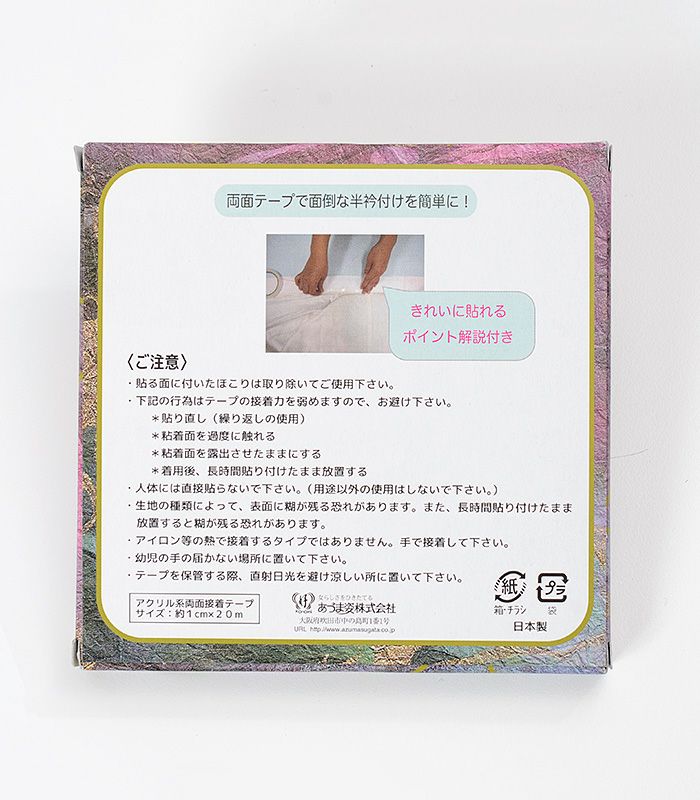 通常の両面テープだと剥がす時にちぎれたり、糊が残ったりしてしまいますが、この半衿用両面テープは綺麗に取れて片づけもらくらくです。