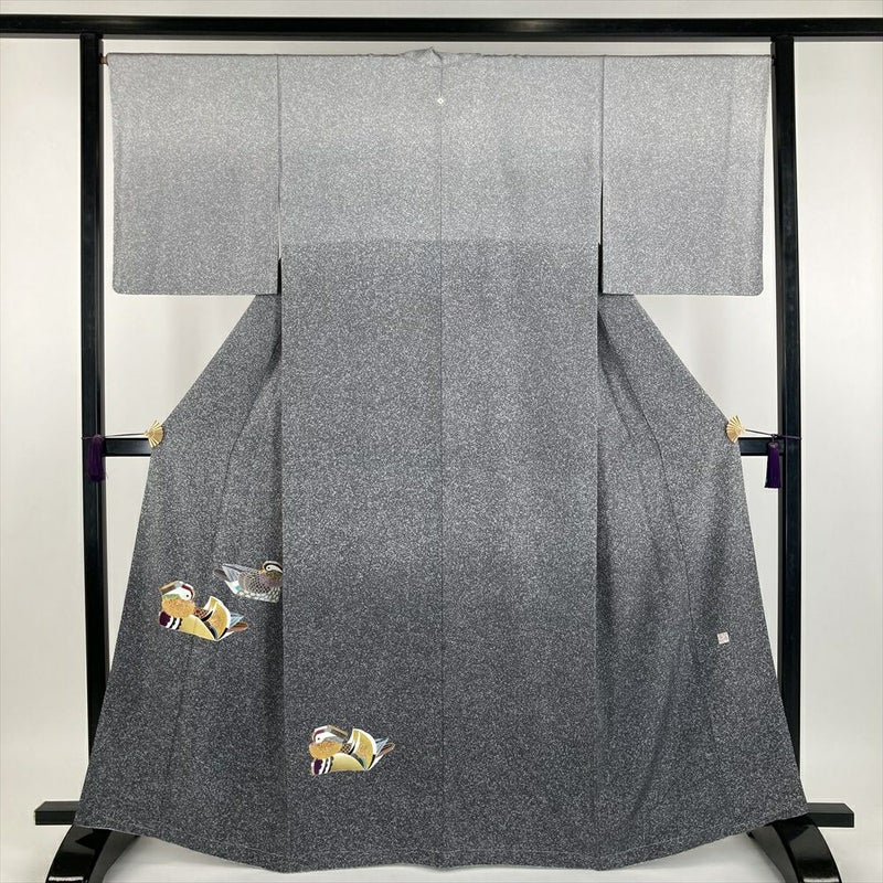 (中古)人間国宝 羽田登喜男 訪問着 グレー フォーマル ちりめん 染め 金銀彩 鴛鴦 袷【身丈】159cm【裄丈】67cm