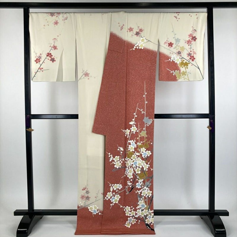 (中古) 羽田登喜氏 訪問着 クリーム色 ピンク 卵色 珊瑚色 フォーマル ちりめん 染め 梅 袷【身丈】169cm【裄丈】70cm