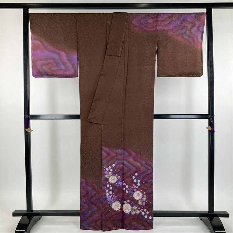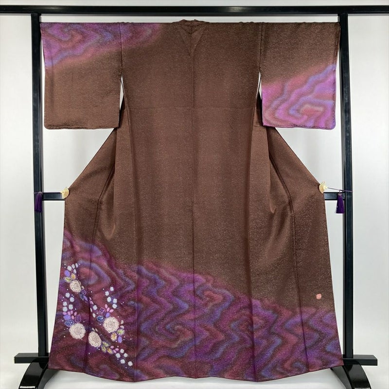 (中古)久保田一竹 訪問着 茶 臙脂色 紫色 フォーマル 金通し 染め 辻が花 二代目久保田一竹 袷【身丈】158cm【裄丈】68cm