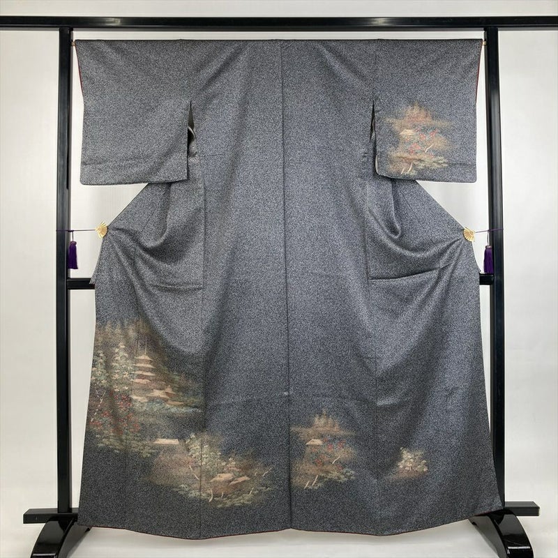 (中古)訪問着 黒 セミフォーマル たたき染め 金彩 山寺 松竹梅 袷 S【身丈】158.5cm【裄丈】67cm