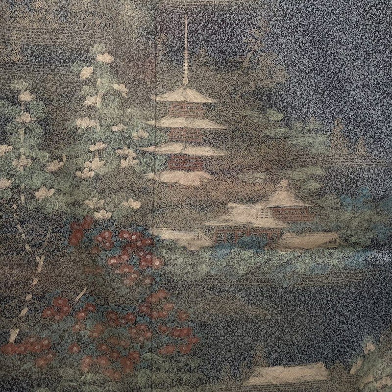 背、脇、衽、襟など縫合せの部分にも模様が続きます、染めや刺繍など様々な技法により細部まで緻密に計算され華やかで美しく仕上がっています。着物には様々な柄が存在します。見た目の好みで決めるのももちろん良いですが、それぞれの柄に込められた意味を知って柄を選ぶのも一つの楽しみです。保存臭がややございます。