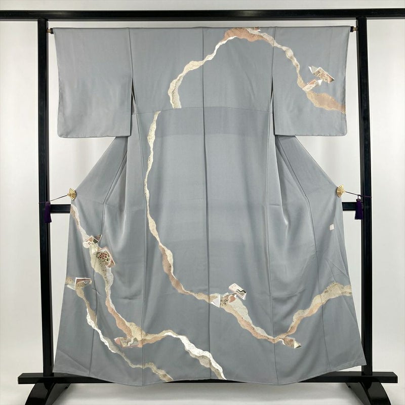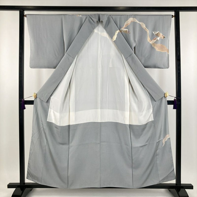 (中古) 訪問着 グレー 灰色 セミフォーマル ちりめん 金彩 刺繍 冊子文 袷【身丈】151.5cm【裄丈】65cm