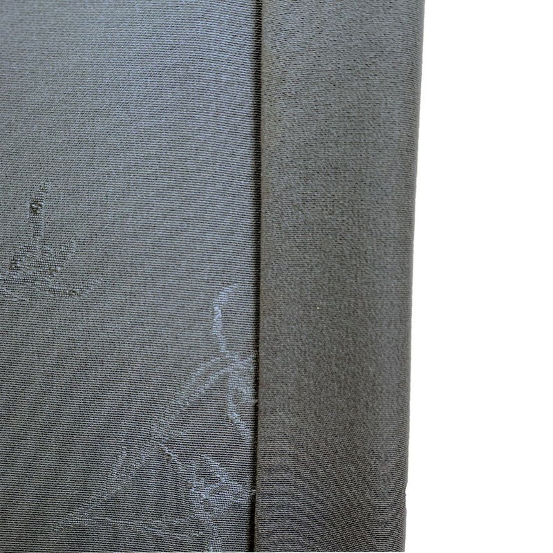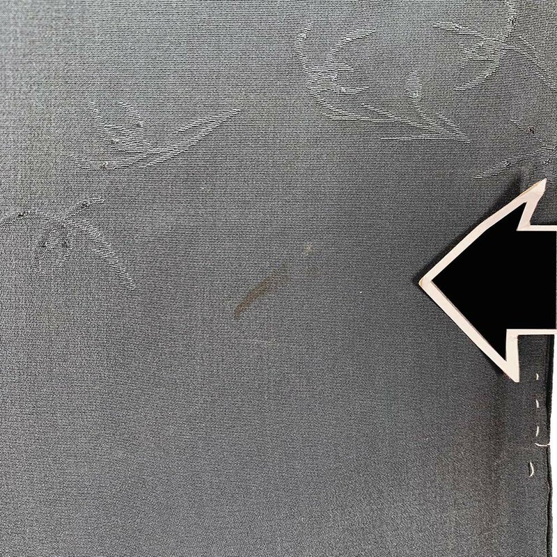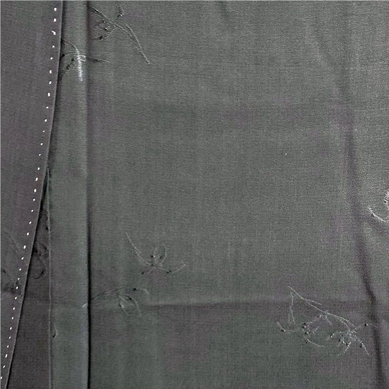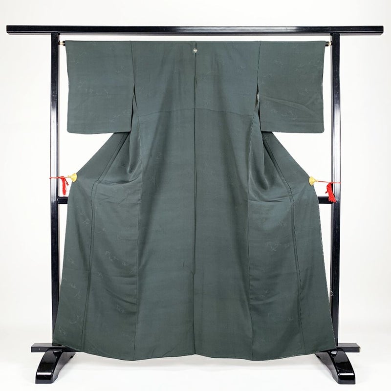 深緑色の地紋織りで草花がデザインされている色無地です。背紋があります。セミフォーマルなお席でお召いただけます。袖後ろに黒い擦れたような汚れが見られます。身頃にも白い汚れが見られます。しつけが一部残っています。