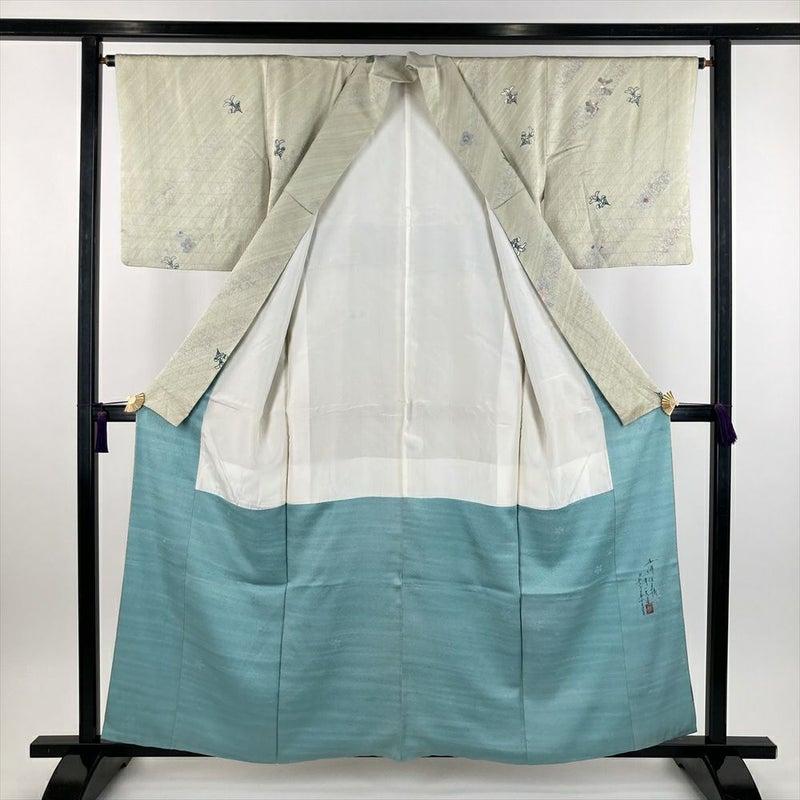 (中古)訪問着 薄緑 セミフォーマル 地紋織り 染め 斜め取り 四季の草花 袷 SS【身丈】152.5cm【裄丈】64.5cm
