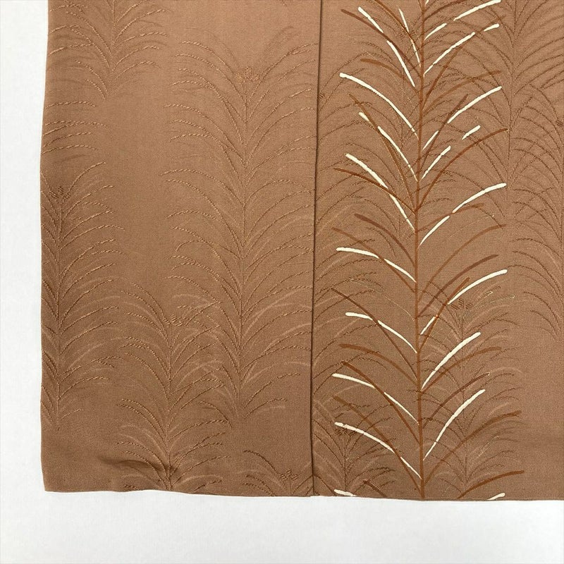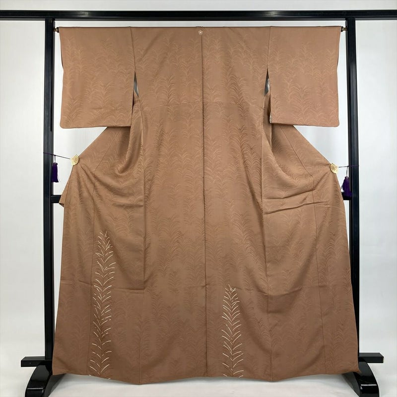 (中古)訪問着 茶 セミフォーマル 地紋織り 染め 一つ紋 刺繍 金彩 若杉 袷 M【身丈】162.5cm【裄丈】66cm