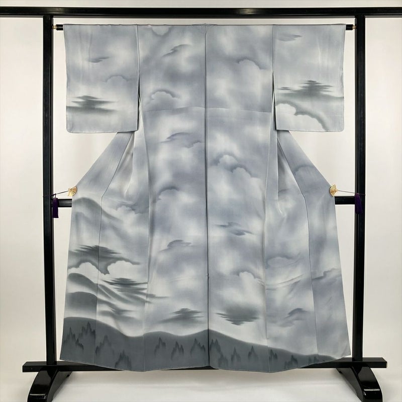 (中古)訪問着 薄灰 グレー セミフォーマル 染め 雲 山並み 袷 SS【身丈】152cm【裄丈】64cm
