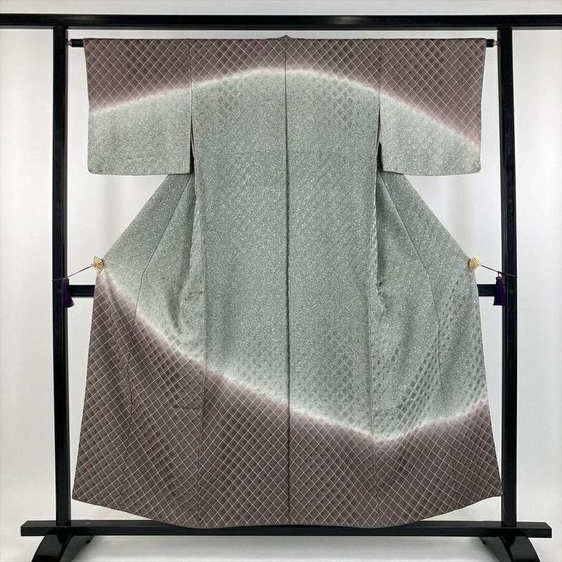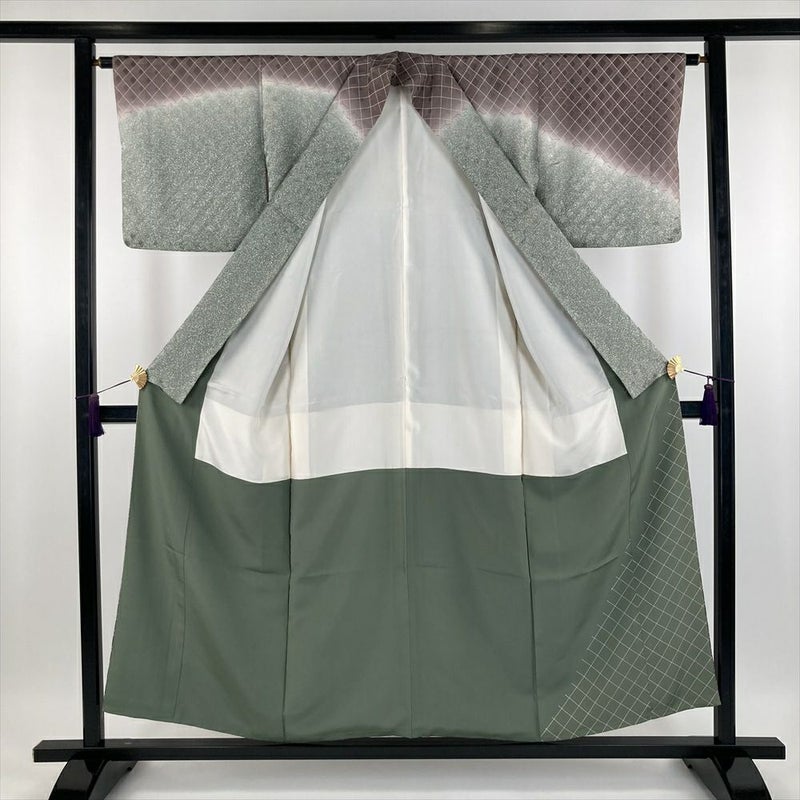 (中古) 訪問着 灰茶色 灰緑色 セミフォーマル カジュアル 地紋織り 染め 菱 幾何学 袷【身丈】149.5cm【裄丈】63cm