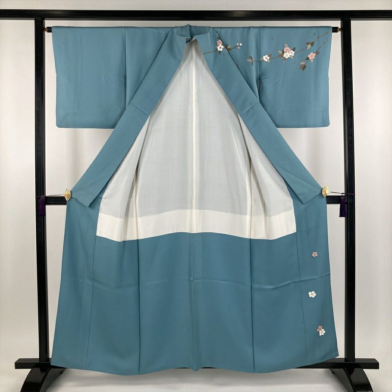 (中古) 訪問着 水色 セミフォーマル 染め 銀彩 桜 袷【身丈】153cm【裄丈】64cm