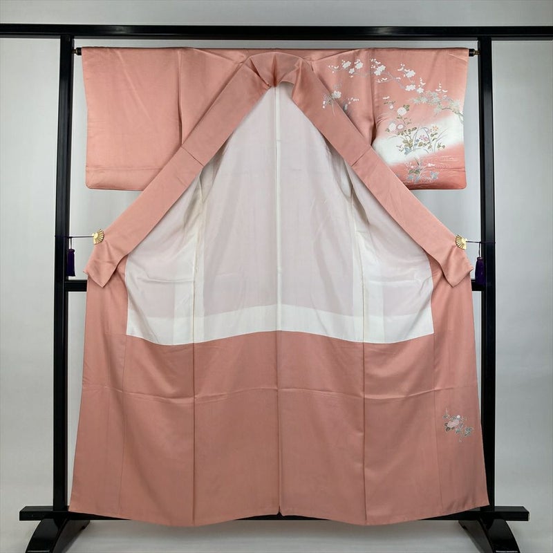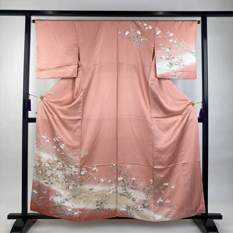 (中古)訪問着 薄ピンク セミフォーマル 地紋織り 染め 金彩 鴛鴦 四季の草花 袷 S【身丈】155.5cm【裄丈】64.5cm