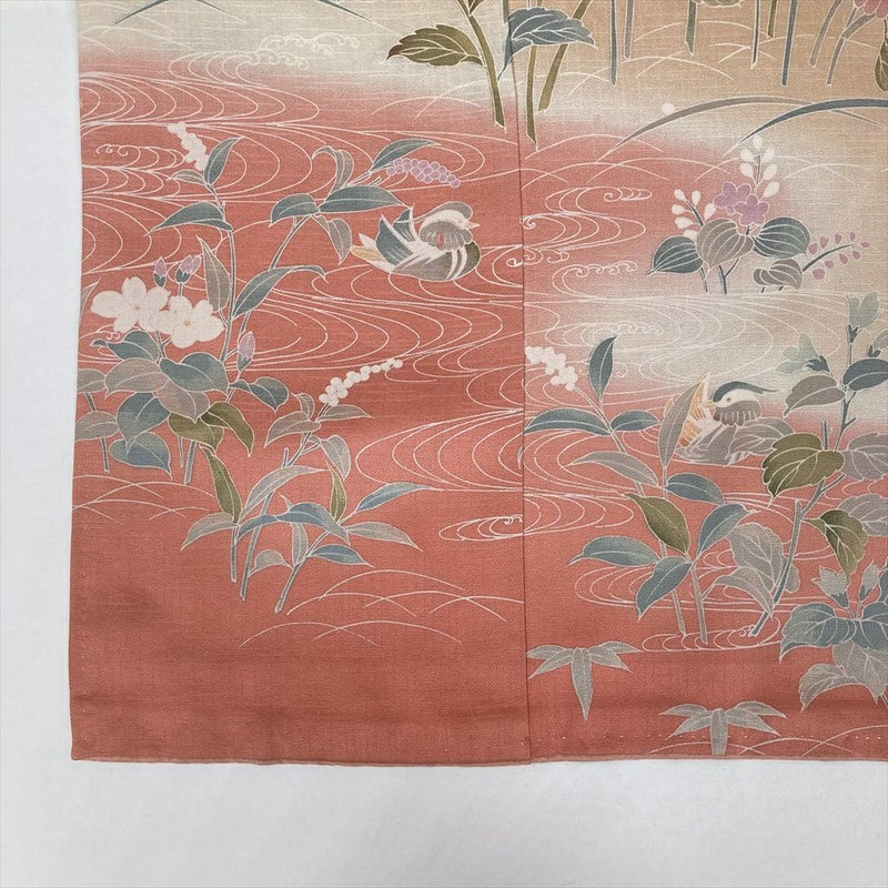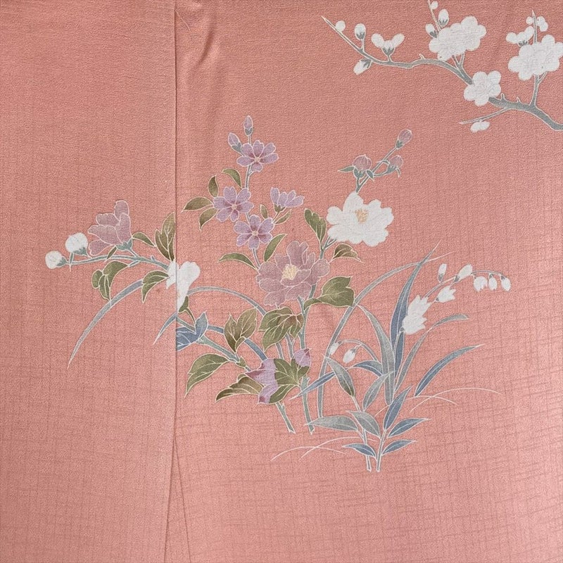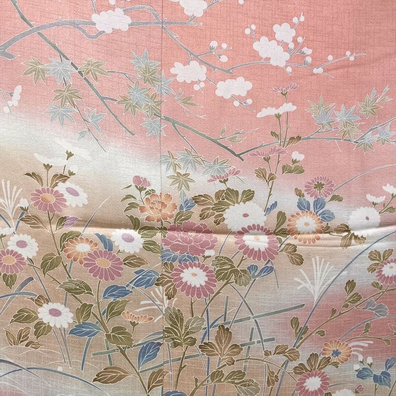 【色柄】薄ピンク セミフォーマル 地紋織り 染め 金彩 鴛鴦 四季の草花