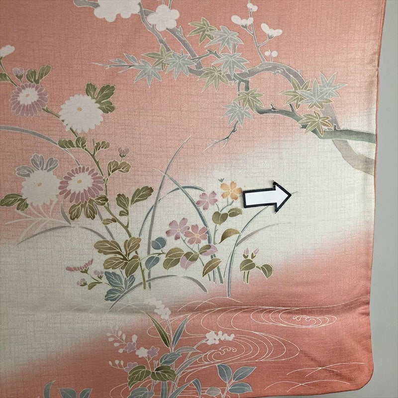 背、脇、衽、襟など縫合せの部分にも模様が続きます、染めや刺繍など様々な技法により細部まで緻密に計算され華やかで美しく仕上がっています。着物には様々な柄が存在します。見た目の好みで決めるのももちろん良いですが、それぞれの柄に込められた意味を知って柄を選ぶのも一つの楽しみです。衿、右後袖にシミ汚れがございます。保存臭がややございます。たたみシワがございます。