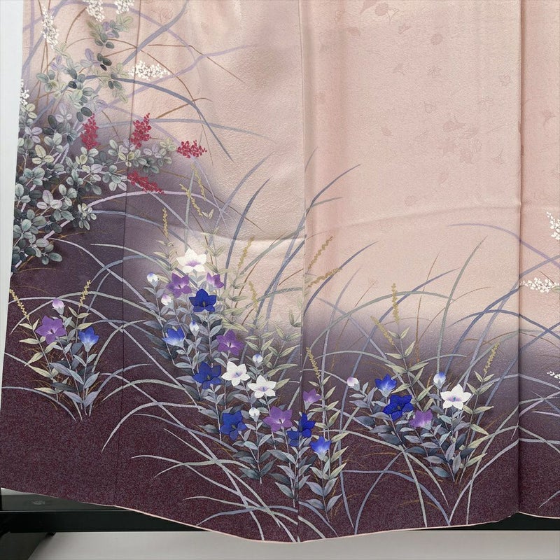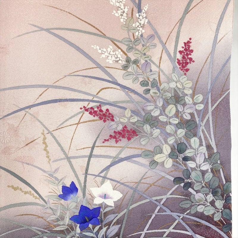 竜胆の紫、萩の薄紅色。二つの花が織りなす色彩は、秋の訪れを告げる美しいハーモニー。優しい地色に裾の濃い色が、着姿を引き締め、より一層優美な印象を与えます。