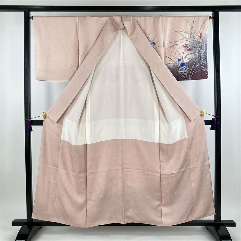 (中古) 訪問着 ベビーピンク色 セミフォーマル 地紋織り 染め 金彩 萩 桔梗 袷【身丈】151.5cm【裄丈】65cm