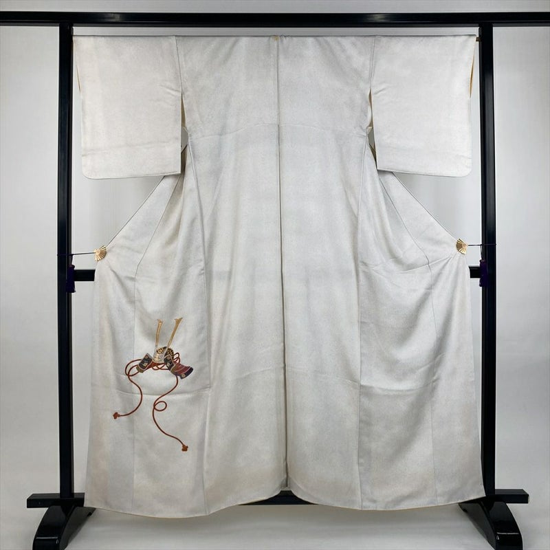 (中古)訪問着 薄灰 グレー セミフォーマル 地紋織り 染め 一つ紋 刺繍 兜 袷 SS【身丈】154.5cm【裄丈】67.5cm