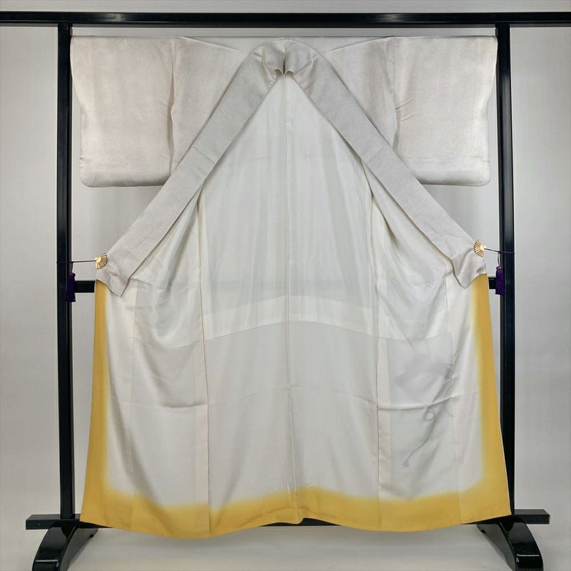 背、脇、衽、襟など縫合せの部分にも模様が続きます、染めや刺繍など様々な技法により細部まで緻密に計算され華やかで美しく仕上がっています。着物には様々な柄が存在します。見た目の好みで決めるのももちろん良いですが、それぞれの柄に込められた意味を知って柄を選ぶのも一つの楽しみです。右前身下にシミ汚れがございます。保存臭がややございます。背中心と左袖表に汚れがございます。