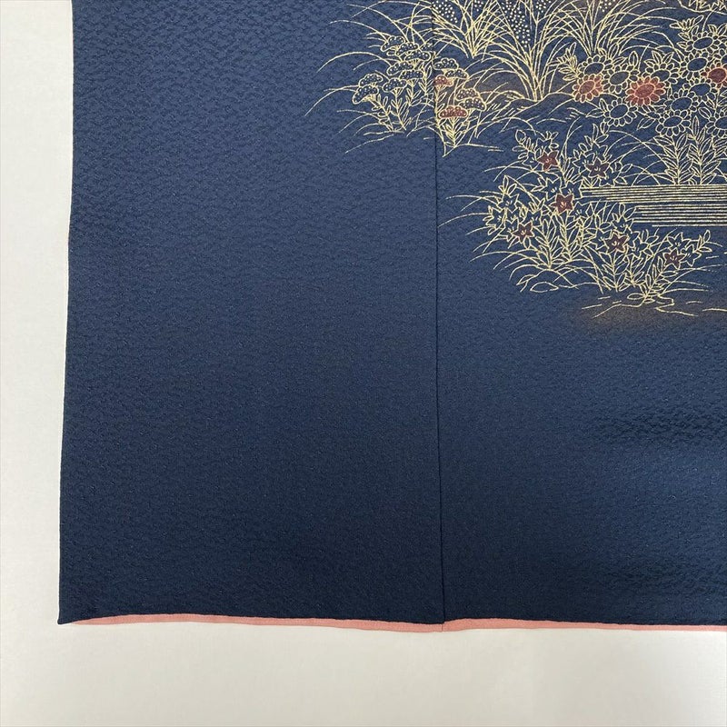 (中古)訪問着 鉄紺 セミフォーマル 地紋織り 染め 一つ紋 金彩 家屋に四季の草花 袷 SS【身丈】154.5cm【裄丈】65cm