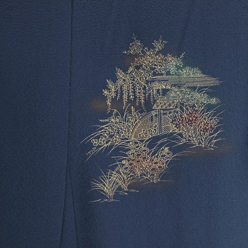 【色柄】鉄紺 セミフォーマル 地紋織り 染め 一つ紋 金彩 家屋に四季の草花
