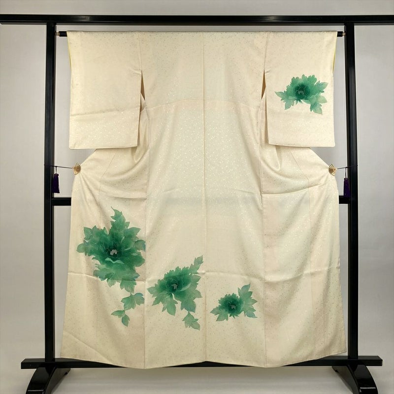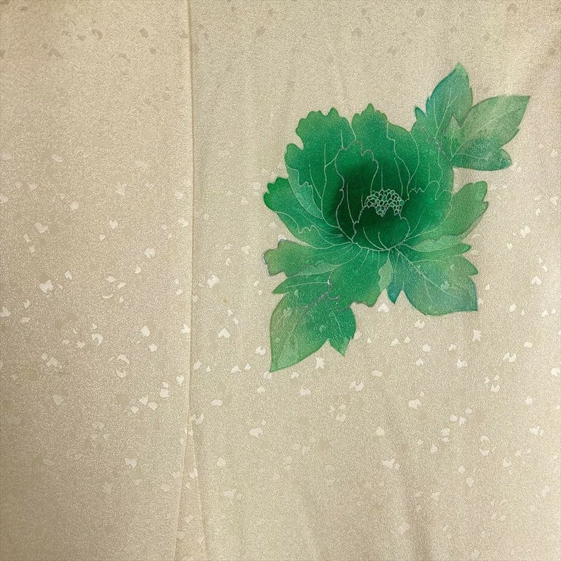 (中古)訪問着 薄黄 クリーム セミフォーマル 地紋織り 染め 銀駒刺繍 銀彩 牡丹 袷 SS【身丈】153cm【裄丈】62.5cm