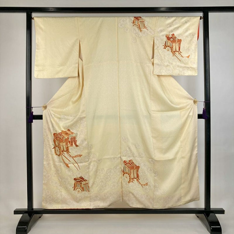 (中古)訪問着 薄黄 セミフォーマル 地紋織り 染め 金駒刺繍 金彩 菊 御所車 袷 SS【身丈】152.5cm【裄丈】64.5cm