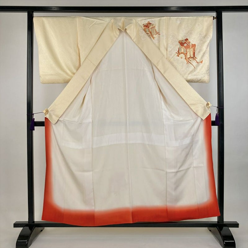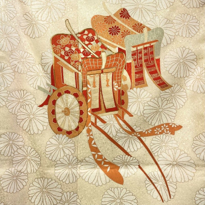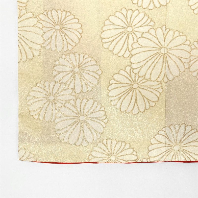 背、脇、衽、襟など縫合せの部分にも模様が続きます、染めや刺繍など様々な技法により細部まで緻密に計算され華やかで美しく仕上がっています。着物には様々な柄が存在します。見た目の好みで決めるのももちろん良いですが、それぞれの柄に込められた意味を知って柄を選ぶのも一つの楽しみです。左前身の刺繍にほつれがございます。左胸に汚れがございます。保存臭がややございます。
