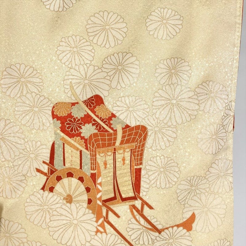 【色柄】薄黄 セミフォーマル 地紋織り 染め 金駒刺繍 金彩 菊 御所車