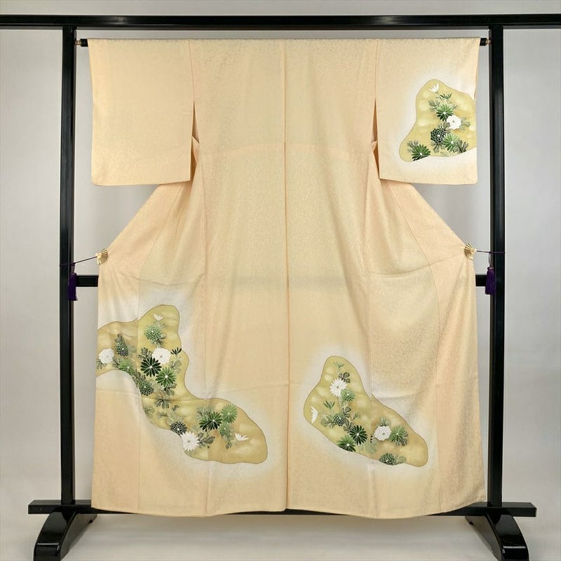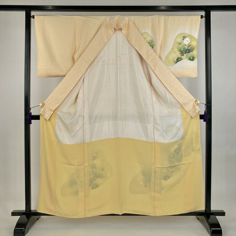 (中古)訪問着 薄黄 セミフォーマル 地紋織り 染め 金彩 菊 袷 SS【身丈】154cm【裄丈】64.5cm