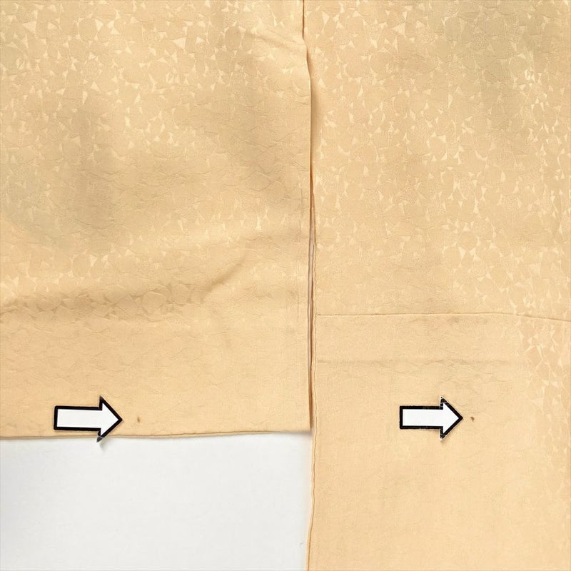 背、脇、衽、襟など縫合せの部分にも模様が続きます、染めや刺繍など様々な技法により細部まで緻密に計算され華やかで美しく仕上がっています。着物には様々な柄が存在します。見た目の好みで決めるのももちろん良いですが、それぞれの柄に込められた意味を知って柄を選ぶのも一つの楽しみです。左前袖、右後袖、左前身、右後身に色泣きがございます。保存臭がややございます。