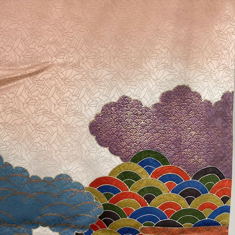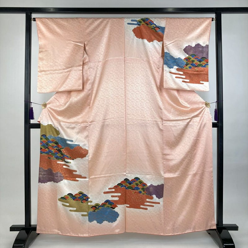 【色柄】薄珊瑚 ピンク セミフォーマル 地紋織り 染め 金駒刺繍 金彩 雲 吉祥文
