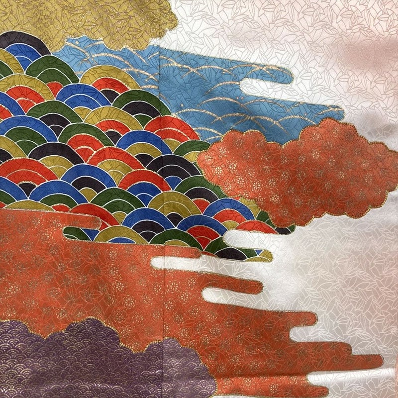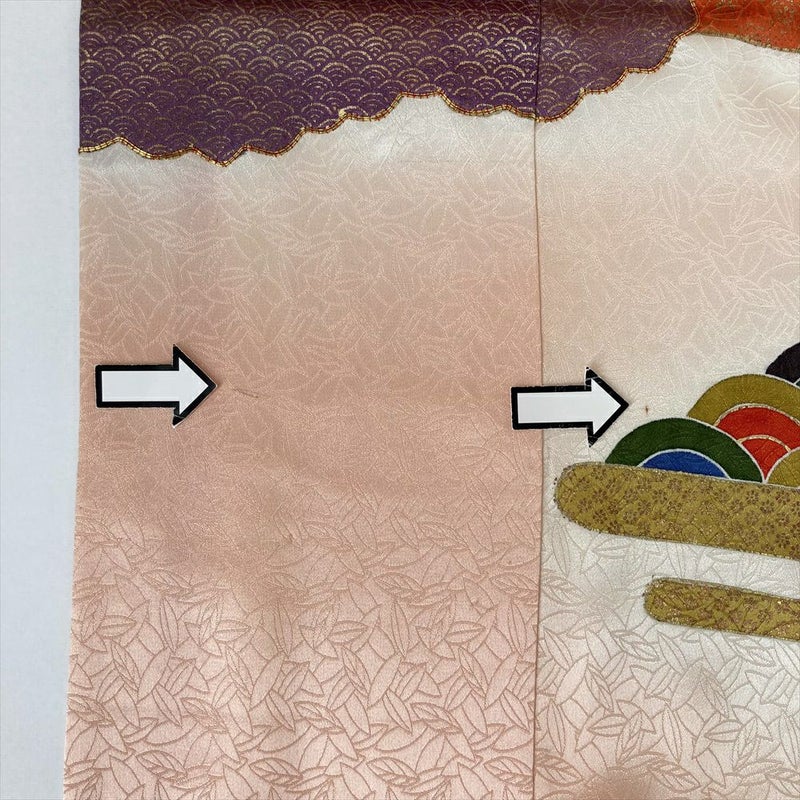 背、脇、衽、襟など縫合せの部分にも模様が続きます、染めや刺繍など様々な技法により細部まで緻密に計算され華やかで美しく仕上がっています。着物には様々な柄が存在します。見た目の好みで決めるのももちろん良いですが、それぞれの柄に込められた意味を知って柄を選ぶのも一つの楽しみです。左前身、右後身にシミ汚れがございます。袖口に汚れがございます。保存臭がややございます。