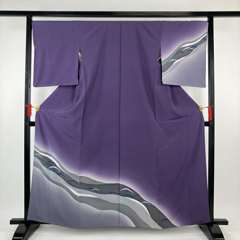 (中古)訪問着 紫 フォーマル セミフォーマル ちりめん ぼかし染め 斜め霞 露芝 袷 S【身丈】157.5cm 【裄丈】67cm