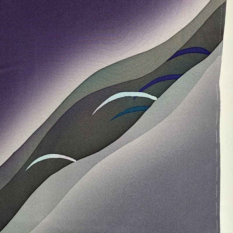 しっとりとした正絹ちりめんの生地に、妖艶な紫色が美しくぼかし染めされた訪問着。グラフィカルな霞に露芝がモダンな雰囲気を醸し出し、大人の女性の魅力を引き立てます。