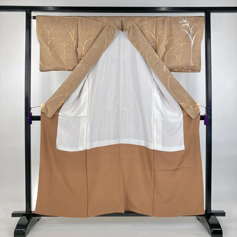 (中古)訪問着 柳茶 茶 セミフォーマル 地紋織り 染め 銀彩 四季の草花 袷 SS【身丈】152.5cm【裄丈】66.5cm