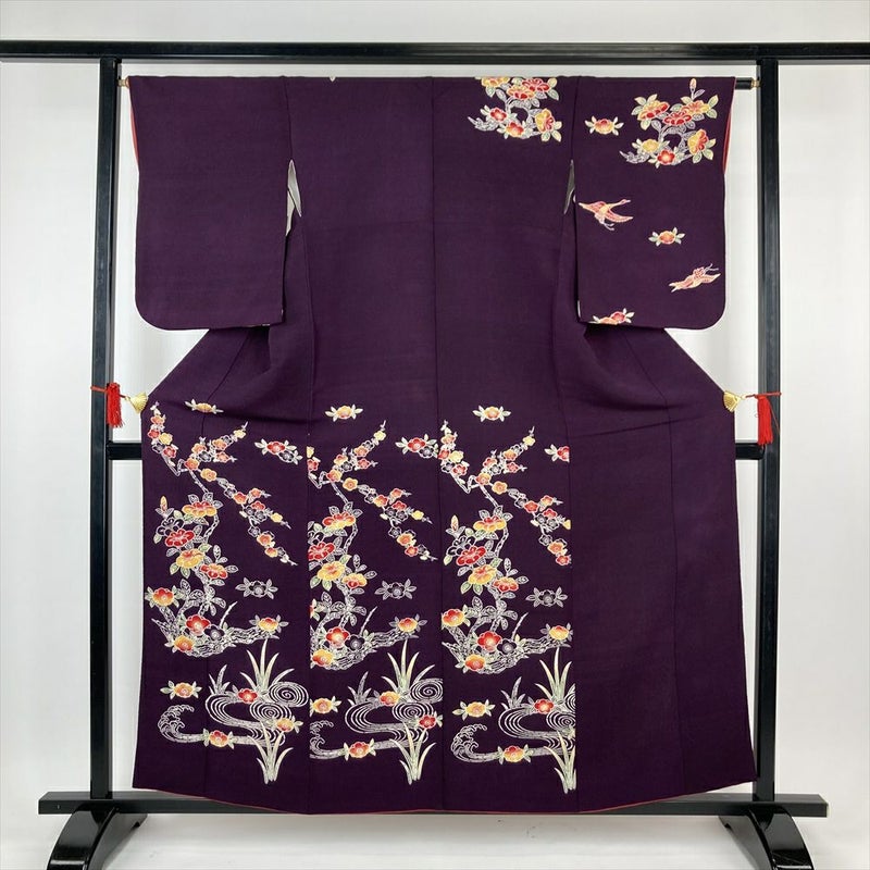 (中古)訪問着 紫 フォーマル セミフォーマル ちりめん 型絵染め 椿 梅 鶴 袷 S【身丈】156.5cm【裄丈】65cm
