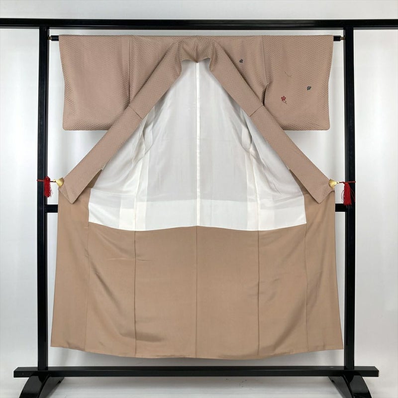 静かに、しかし確かに、時を重ねるごとに深みを増す美しさ。今回ご紹介するのは、上品な薄茶色に染め上げられた、地紋織りの訪問着です。