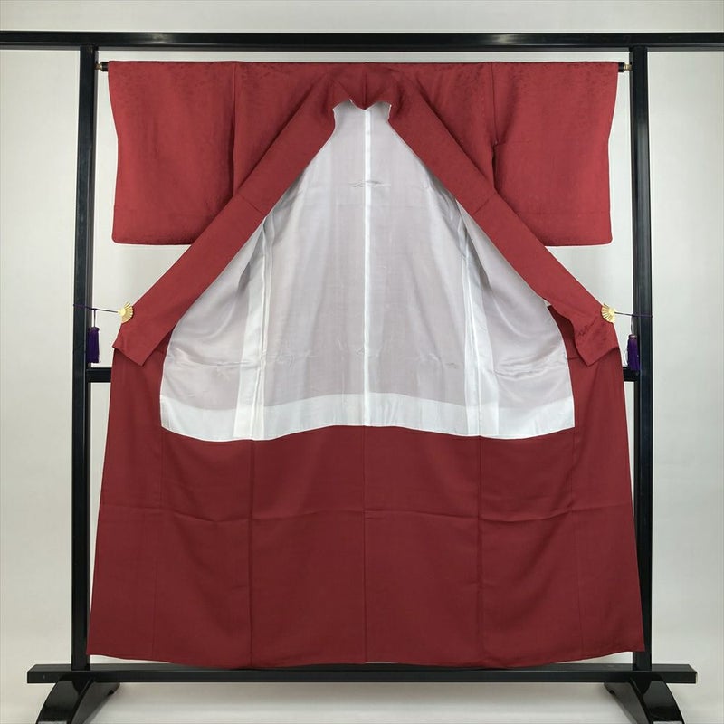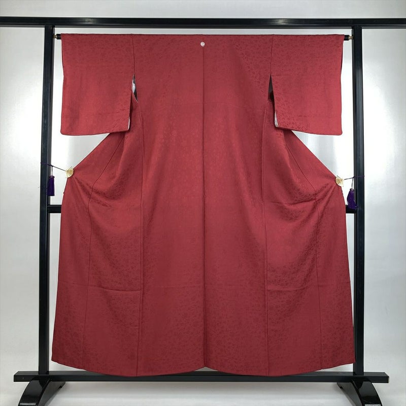 (中古)色無地 赤 セミフォーマル 地紋織り 一つ紋 丸に横木瓜 袷 SS【身丈】150cm 【裄丈】64.5cm