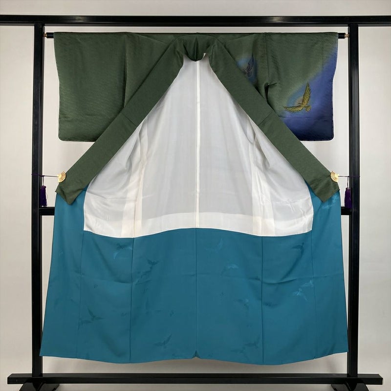 (中古)訪問着 緑 フォーマル セミフォーマル 斉藤三才 地紋織り ぼかし染め 金彩 鳩 鳥 袷 SS【身丈】145cm 【裄丈】64cm