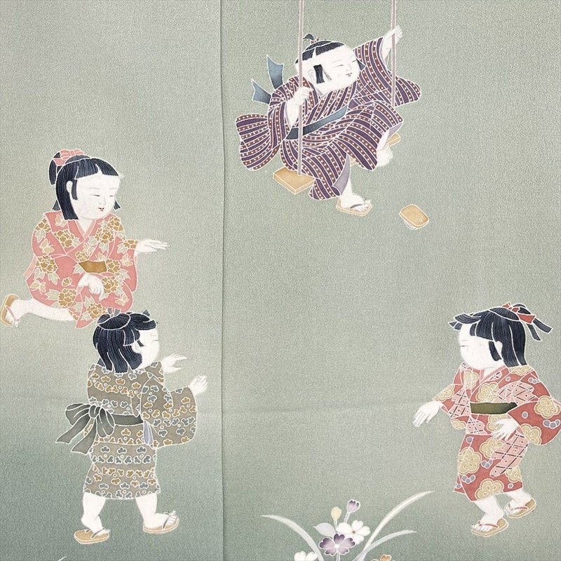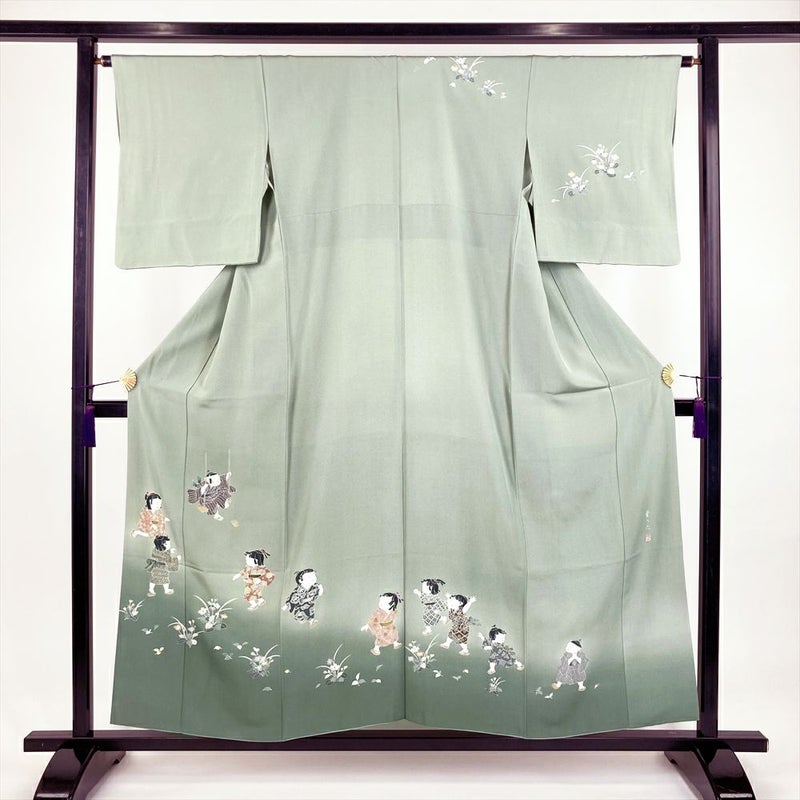 【色柄】薄緑 セミフォーマル ちりめん ぼかし染め 童うた 四季花 落款