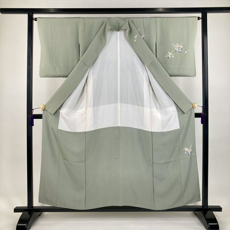 (中古)訪問着 薄緑 セミフォーマル ちりめん ぼかし染め 童うた 四季花 落款 袷 SS【身丈】150.5cm 【裄丈】64.5cm