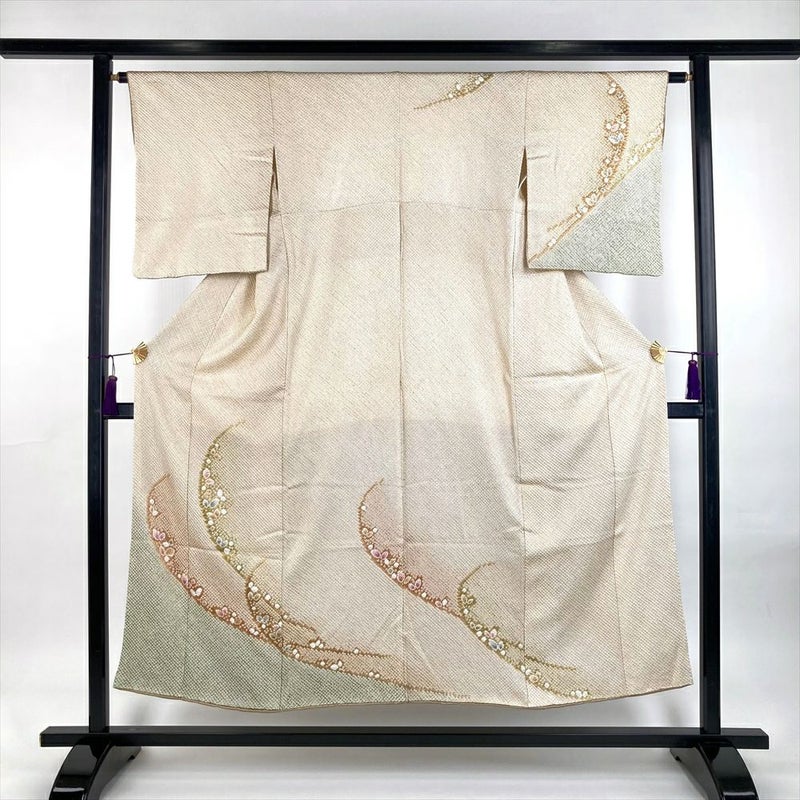 (中古) 訪問着 薄茶 薄緑 ベージュ セミフォーマル 染め 総絞り 鹿の子 袷 SS【身丈】145cm【裄丈】62.5cm