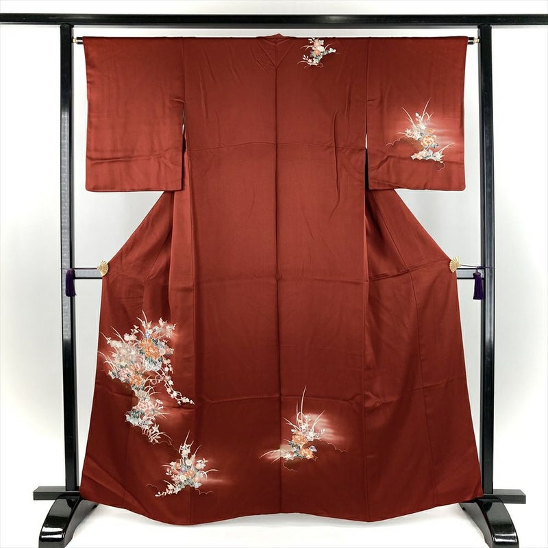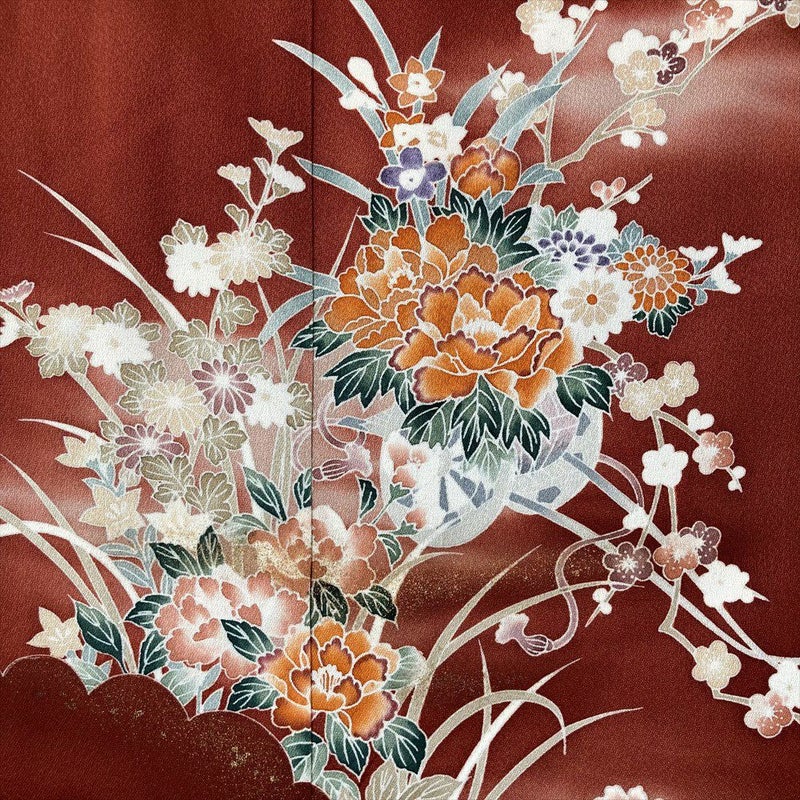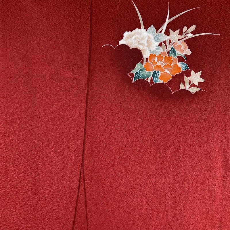同じ柄でも、濃い地色に描かれた柄はくっきりと鮮やかに映えます。牡丹の花は優美で豪華であることから「百花の王」と呼ばれています。セミフォーマルシーンにぴったりなお着物です。リユース品ですが状態は良好ですので、すぐにお使いいただけます。保存臭がややございます。