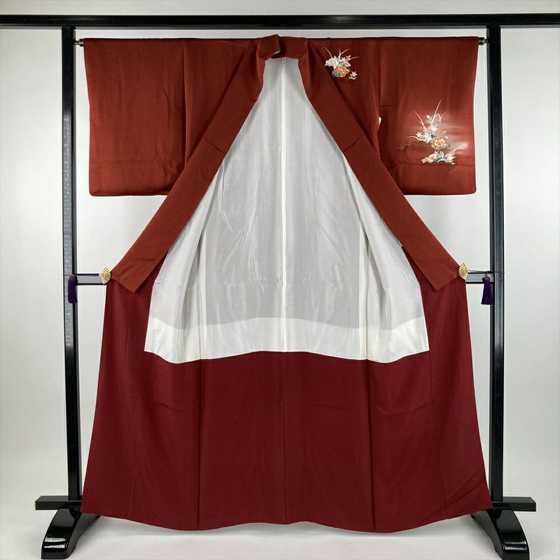 (中古) 訪問着 赤茶色 茶系 赤系 セミフォーマル ぼかし染め 金彩 花車 雲 袷 S 【身丈】158.5cm【裄丈】65cm