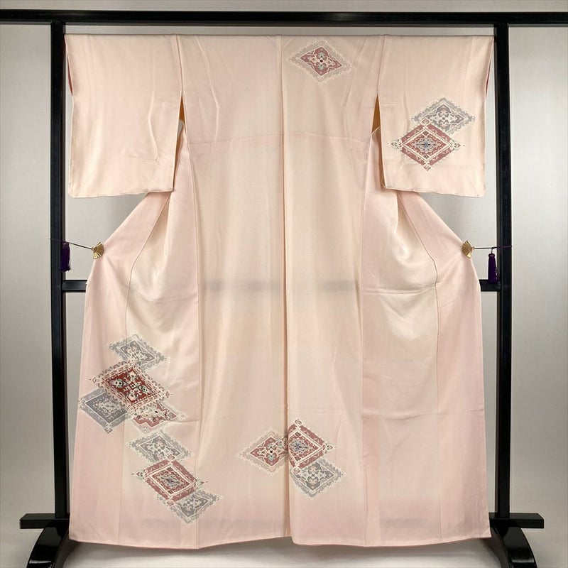 (中古) 訪問着 薄ピンク色 セミフォーマル 地紋織り 菱華文 袷 M【身丈】160cm【裄丈】68cm