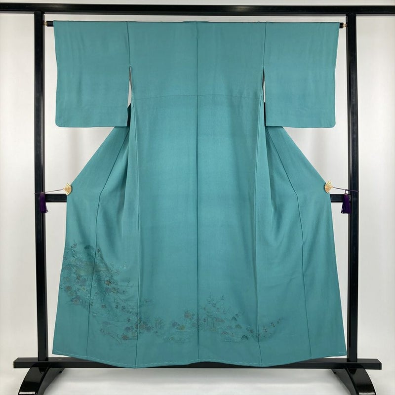 (中古) 付下 青緑色 セミフォーマル ちりめん 刺繍 古都の景色 袷【身丈】151cm【裄丈】64cm