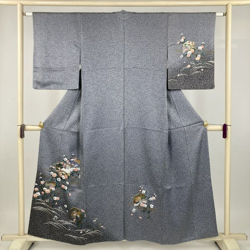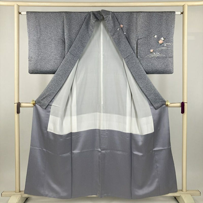 (中古) 訪問着 ブルーグレー セミフォーマル 地紋織り たたき染め 金銀彩 花鳥 袷 絹【身丈】151cm【裄丈】62cm