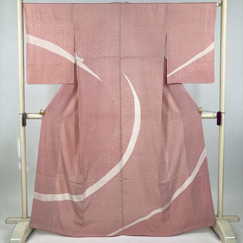 (中古) 訪問着 ピンク 珊瑚色 セミフォーマル ちりめん 染め 江戸小紋柄 袷 絹【身丈】161cm【裄丈】67cm