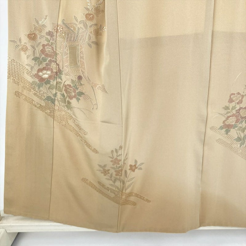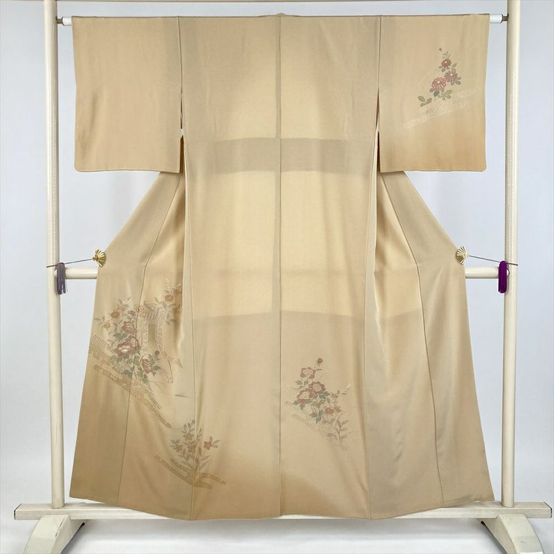 (中古) 訪問着 ベージュ 蜂蜜色 セミフォーマル ちりめん ぼかし染め 刺繍 御所車 四季版 袷 絹【身丈】151cm【裄丈】62cm
