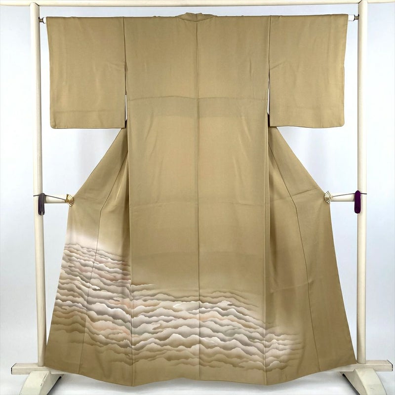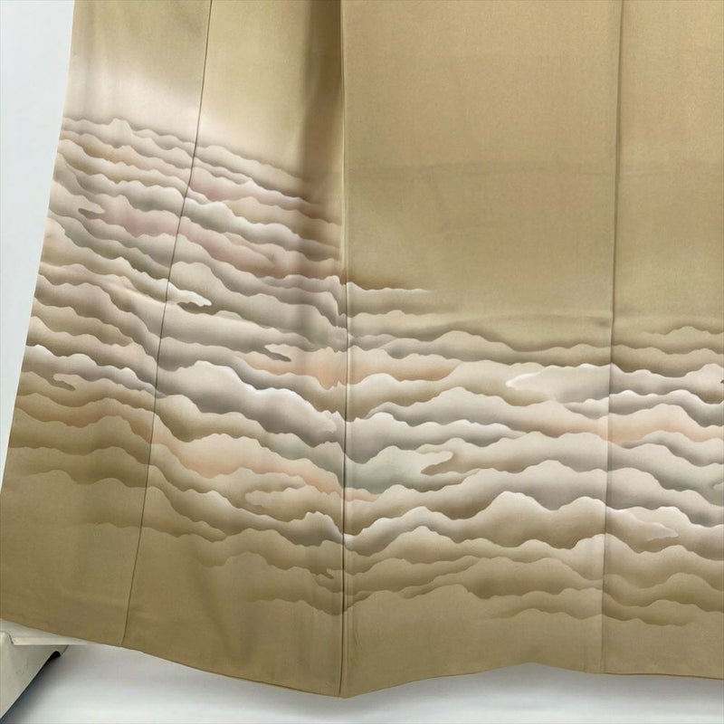 (中古) 訪問着 黄土色 カーキ セミフォーマル 染め 雲海 袷 絹【身丈】152cm【裄丈】64cm