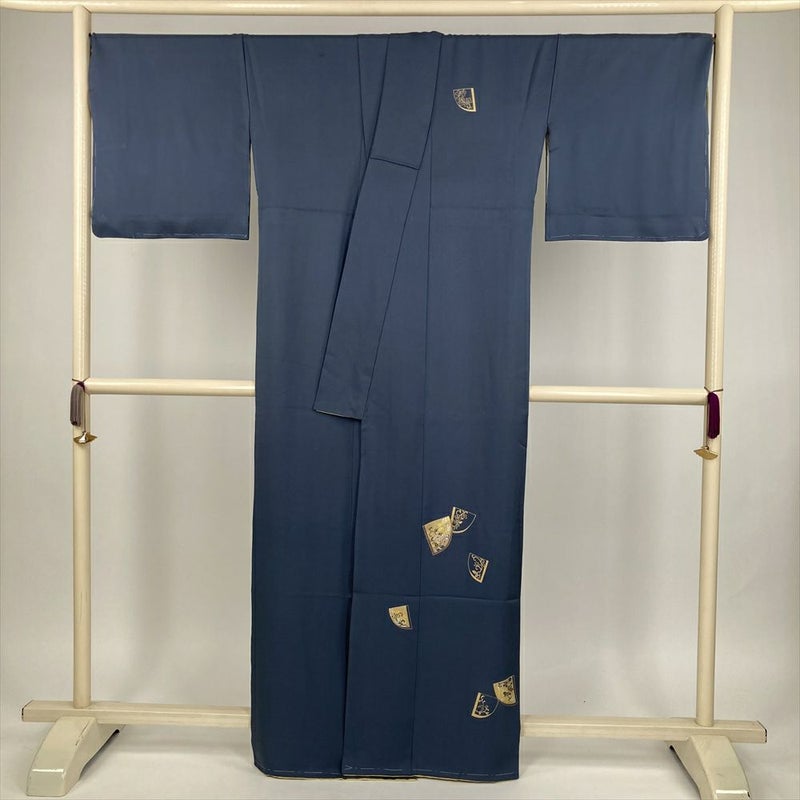 (中古) 訪問着 灰青 セミフォーマル 草花文様 袷 絹 【身丈】157.5cm【裄丈】70cm